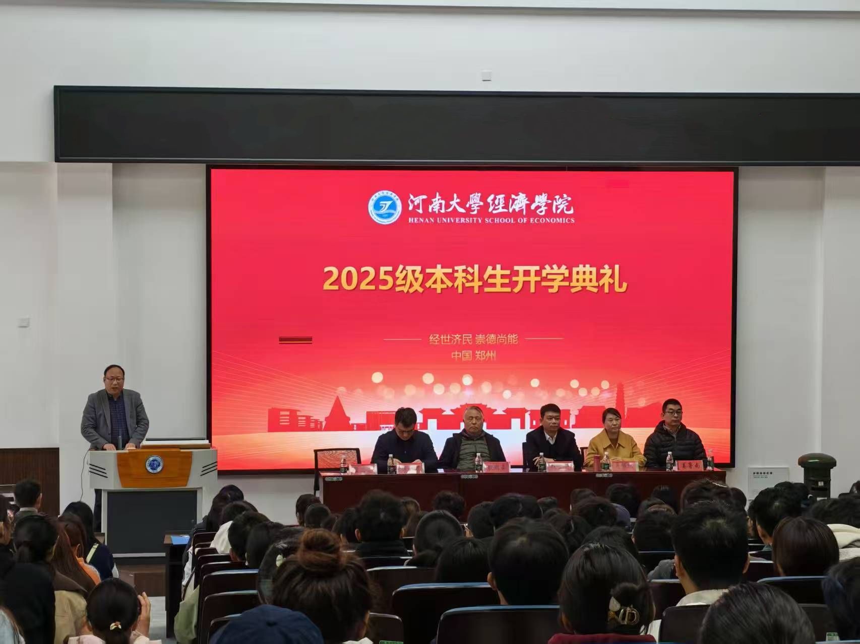 金秋十月,天朗气清。10月25日,河南大学经济学院2025级本科生开学典礼在郑州校区友兰学堂B座104会议室隆重举行。学院领导班子成员、青年教师代表、辅导员、高年级学生代表与全体2025级本科生齐聚一堂,共同开启大学精彩序章。典礼由学院党委副书记翟志远主持。