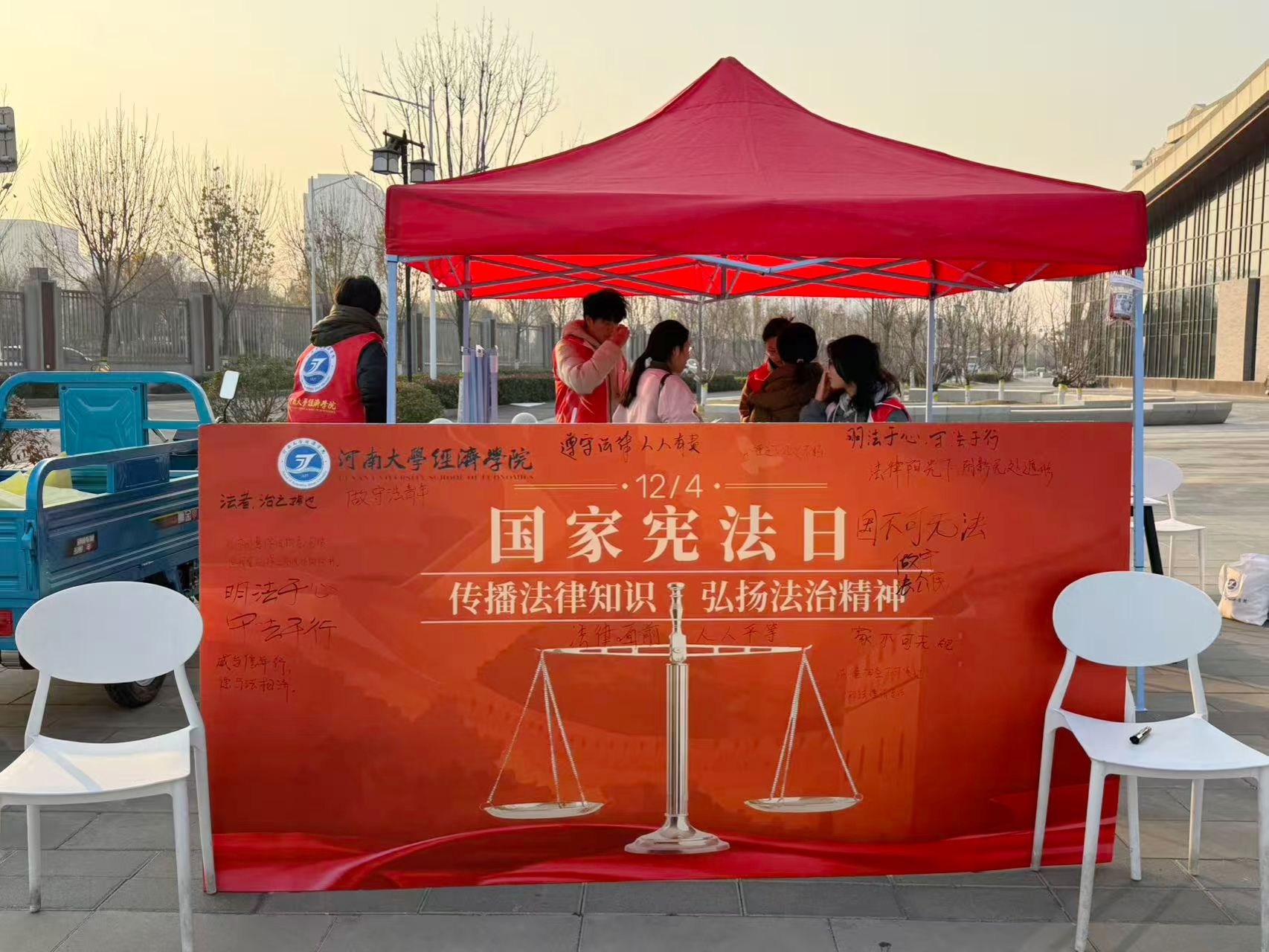 为全面贯彻党的二十大依法治国部署,深入学习宣传法治思想,12月5日,经济学院在龙子湖校区右岸餐厅南门口开展“宪法于心,外化于行”宪法日宣传活动,一天的时光里,宪法精神在互动中传递,法治信仰在实践中扎根,这场青春与法律的邂逅,留下了诸多难忘的瞬间。