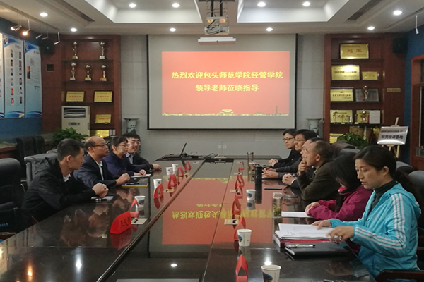 4月25日上午,包头师范学院经管学院党委书记高日晨带领金融系部分教师到我院进行考察交流,我院党委书记田歧立,院长、党委副书记宋丙涛,副院长郑展鹏以及金融系、教务办公室相关负责老师在学院一楼院史馆接待了来访客人,并举行交流座谈会,座谈会由郑展鹏主持。