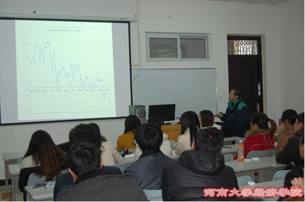 12月1日下午3点,河南大学经济史论坛第二十二期学术报告会在经济学院研究生教室举办。国家外国专家局“国家高端外国专家”村上直树教授受邀作了以“城市化与产业升级—日本东京郊外的发展经验”为主题的报告。我院部分老师及学生参加并聆听了报告。报告会由我院孙建国教授主持。