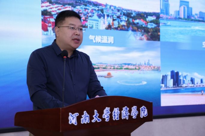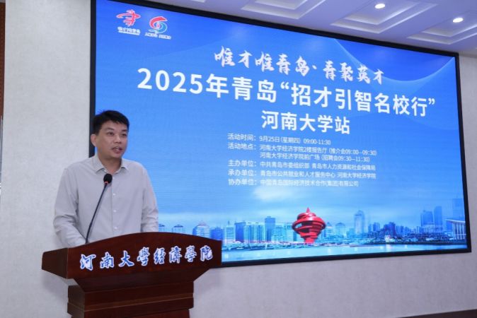 9月25日,2025年青岛“招才引智名校行”(河南大学站)在经济学院举行。青岛市人力资源和社会保障局党组成员、副局长董海波,青岛市公共就业和人才服务中心党委书记、主任高杰等6人莅临宣讲,经济学院党委书记程金辉、副书记翟志远参加活动。