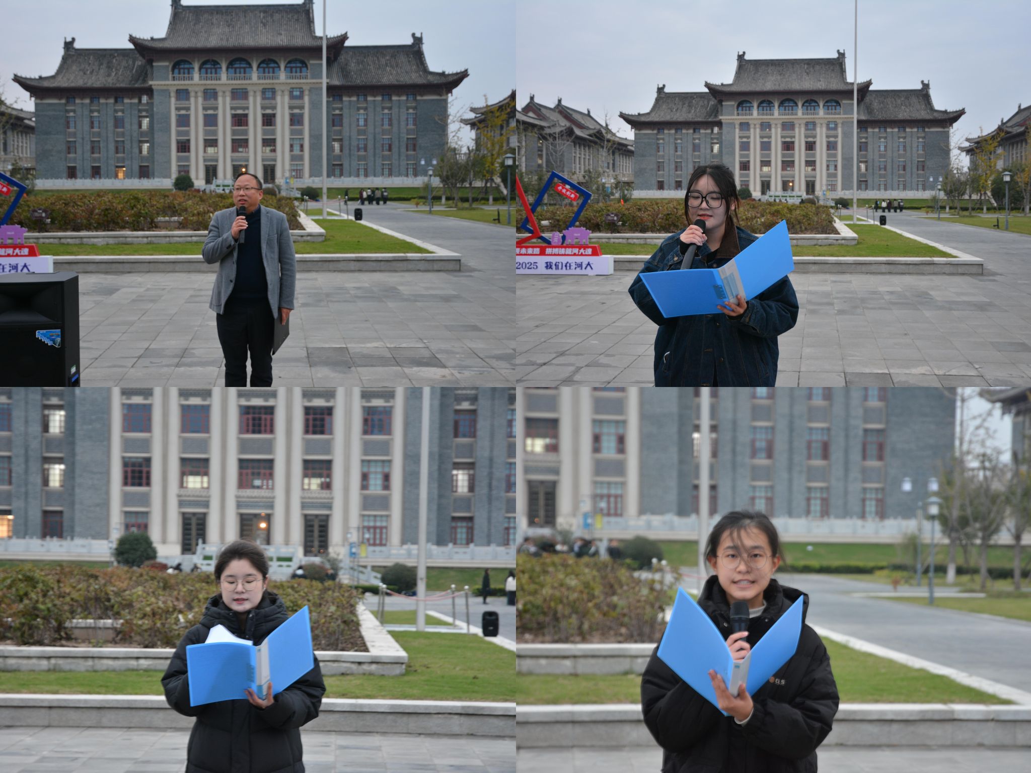 升旗仪式后,2025级学生代表邢瑀夏、2024级学生代表兼年级团支书王怡然、2023级学生代表兼院学生会主席刘铭依次登台,以当代河大学子的鲜明视角传递理想信念与青春担当。他们结合校园飞檐斗拱的建筑风貌、冯友兰“阐旧邦以辅新命”等先辈精神、赵九章科技报国情怀,及学校从抗战辗转办学到“双一流”建设的发展历程,深刻诠释身为河大学子的使命与荣光;同时提出以爱国情怀为内核,在学习中践行“格物致知、修身为本、身体力行、薪火相传”,并以“明德新民、止于至善”校训为指引,呼吁同学们珍惜大学时光,以勤勉求知的姿态、扎实过硬的本领践行“崇德尚能,经世济民”院训,在“两个一百年”奋斗目标历史交汇点上,用实际行动书写不负自我、不负母校、不负新时代的成长答卷。