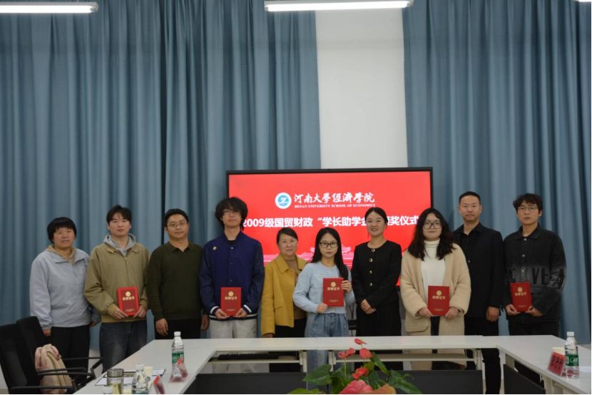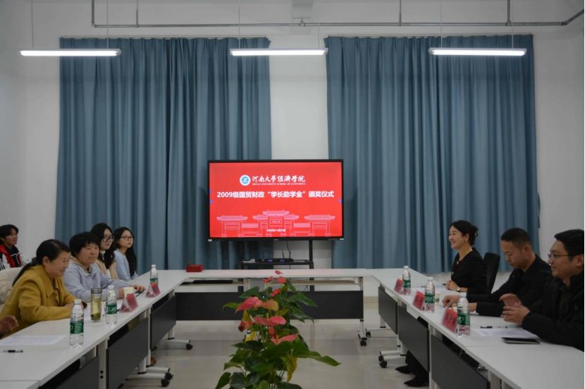 11月21日下午,经济学院第三届2009级国贸财政“学长助学金”发放仪式暨校友论坛在郑州校区科创西楼会议室举行。经济学院副院长吴郁秋、团委负责人陈艳玲,经济学院2009级国贸、财政专业本科毕业生代表王奇、李少楠、张丹丹,以及在校学生代表出席。仪式由陈艳玲主持。