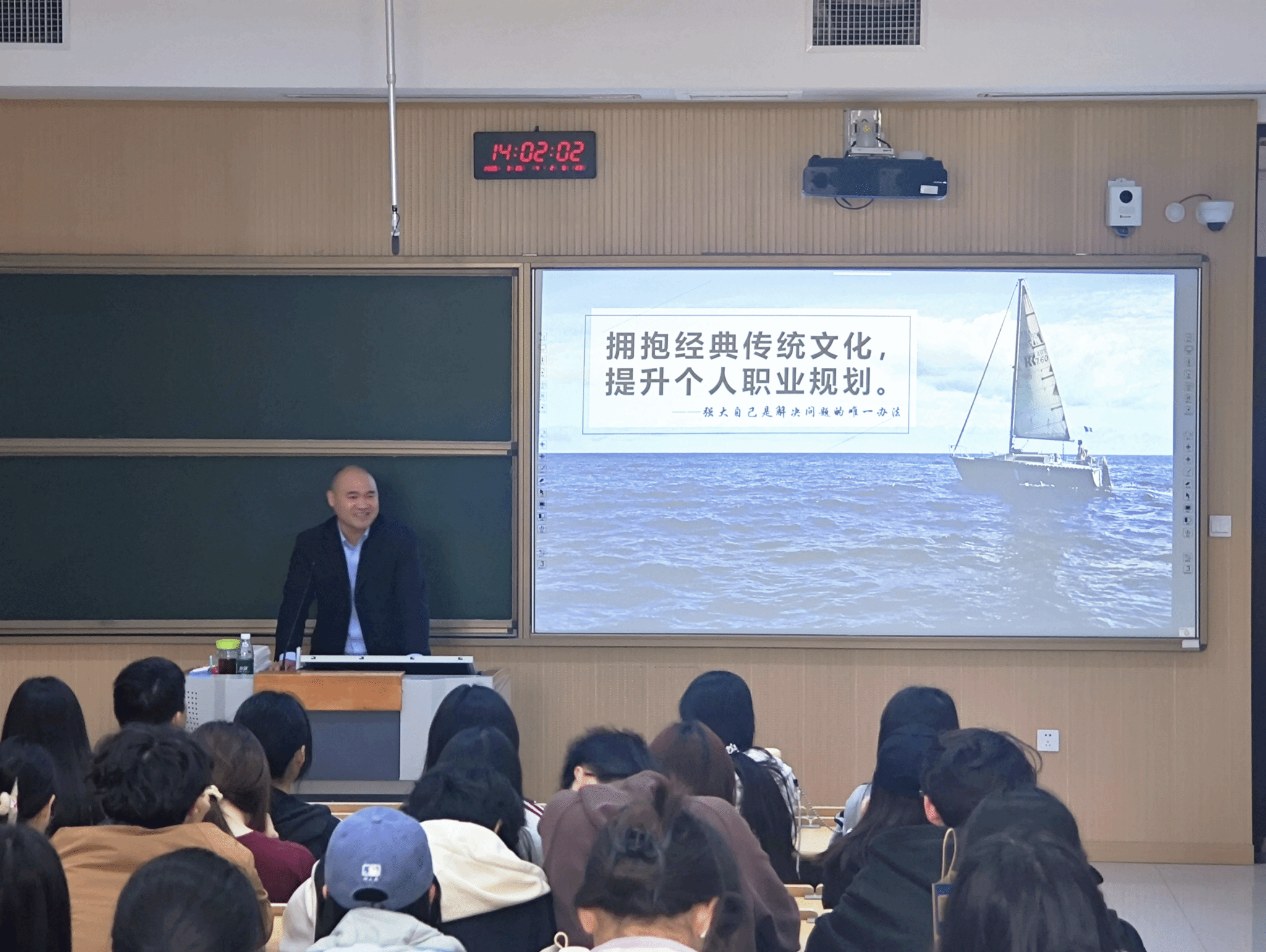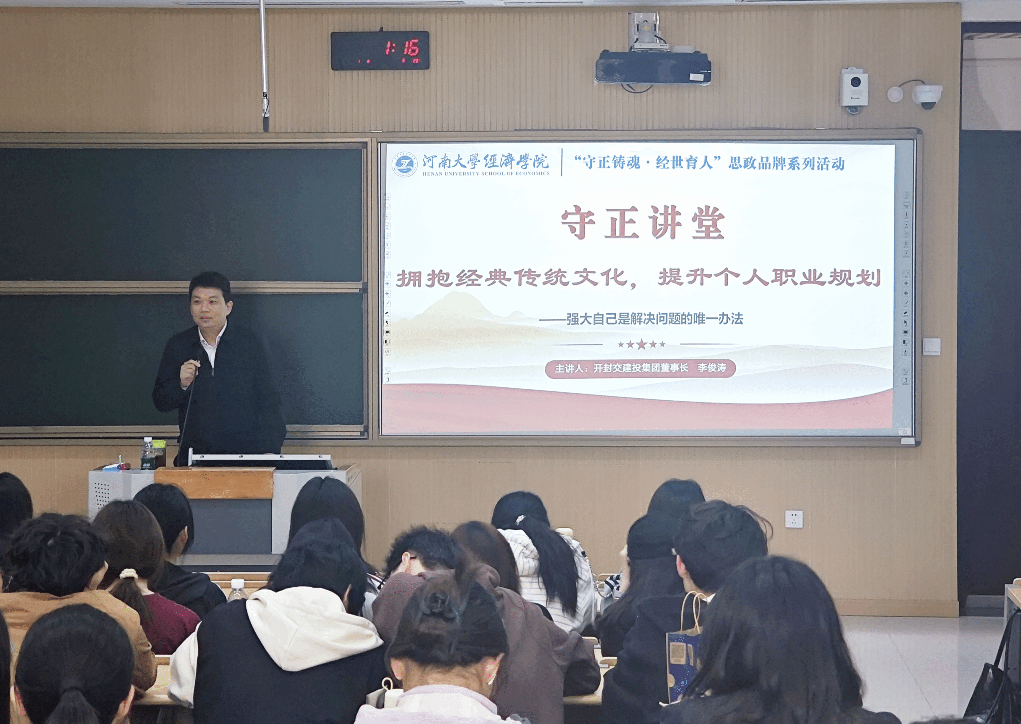 为深入践行“守正铸魂 经世育人”育人理念,引导新时代大学生树立科学的成长观,3月26日下午,经济学院邀请河南大学硕士生导师,河南大学MBA校友会会长、开封交建产业投资有限公司董事长李俊涛在九章学堂南楼B座201开展题为“拥抱经典传统文化,提升个人职业规划”的“守正讲堂”专题讲座,经济学院2025级学生代表、学院青年教师代表到场聆听学习。讲座由经济学院党委书记程金辉主持。