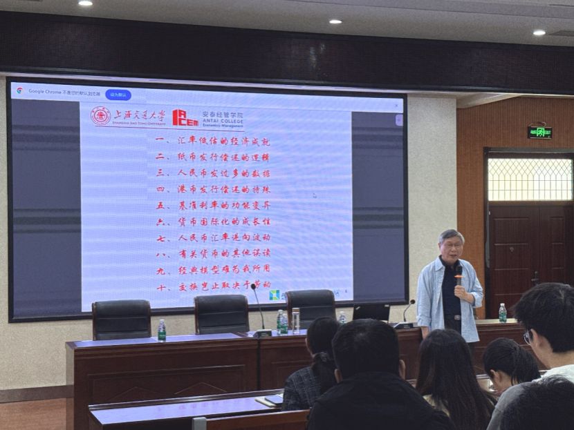讲座中,胡海鸥教授围绕货币理论与实践中的核心议题展开了系统解读。他重点拆解了全球主流货币的发行与流通闭环逻辑,以完整的经济循环视角,还原了美元“发行-流通-偿还-回笼”的全链条运行机制。在此基础上,他进一步解析了人民币的发行流通特征,结合中国广义货币M2余额的历史增长轨迹、M2/GDP 比值的长期变化趋势,以及过去二十年间中国与美、欧、日、英等主要经济体的对比数据,直观且系统地呈现了人民币货币供给的长期运行规律与核心特征。同时,胡海鸥教授结合自身数年的理论研究积淀,对当前货币理论领域的诸多常见误读进行了辨析澄清,引导在场师生跳出固有认知框架,从经济运行的完整循环与本土实际出发,理解货币发行与流通的本质规律。互动交流环节,在场师生踊跃提问,胡海鸥教授逐一进行了耐心细致的解答,结合理论与实践给出了兼具深度与针对性的分析建议,现场学术交流氛围十分浓厚。